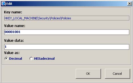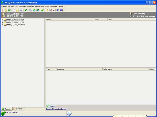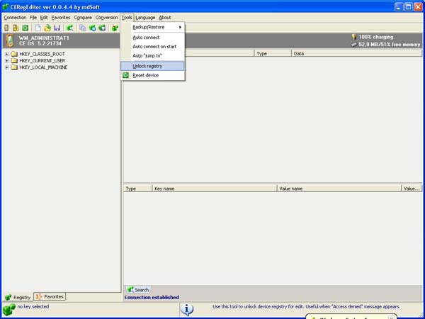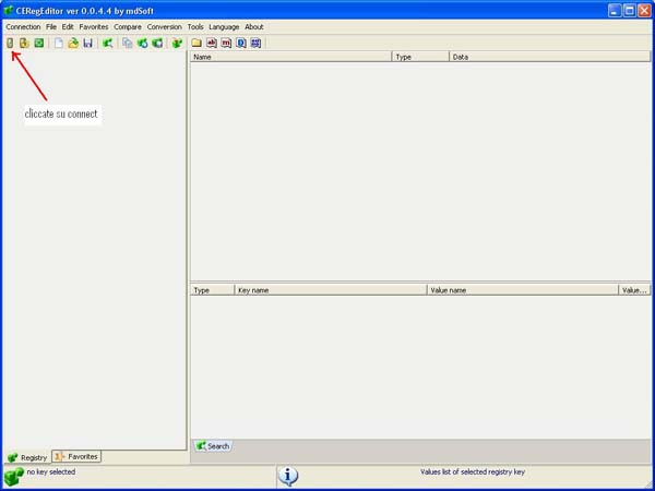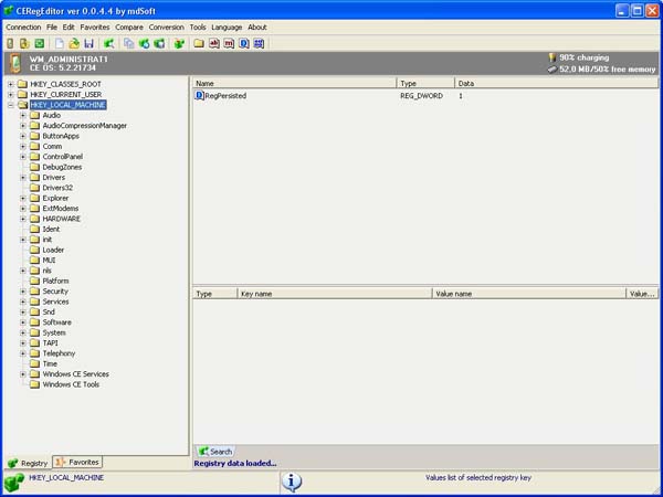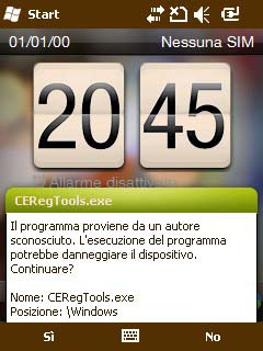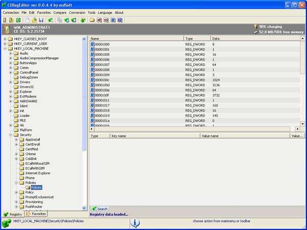 Primo passo: Scaricate un registry editor; io uso CeRegEditor che si installa sul PC o Notebook e legge il registro del telefono tramite il collegamento USB (con active sync attivo). Avrete bisogno anche di itsutilsbin-20070705 o versione superiore. Unlock registry Collegate il telefono al pc o al notebook e aspettate che risulti connesso con active sync. ![]() Ora lanciate il programma CeRegEditor ![]() Cliccate su connect e aspettate che il dispositivo venga riconosciuto ![]() ![]() in alto cliccate su TOOL poi su UNLOCK REGISTRY ![]() il programma vi chiederà se volete veramente farlo ![]() Clicchiamo su "yes". Sul telefono apparirà un messaggio in cui chiede conferma dell'operazione. ![]() Diamo la conferma Su CeRegEditor, apparirà questo popup. ![]() Ora possiamo agire sul registro per sbloccare definitivamente il terminale. Verificare se il nostro terminale è application locked. Entrate in HKEY_LOCAL_MACHINE ![]() Andate in: Security> Policies> Policies ![]() Controllate la stringa: 00001001 ![]() Se il value data è 1, il terminale è sbloccato, altrimenti mettetelo a 1 e salvate, poi fate un soft reset è verificate che la modifica sia rimasta. Ora il telefono è aperto alle modifiche e alla possibilità di effettuare un DUMP DUMP Create una directory Rom, e decomprimete all'interno itsutilsbin; create anche un collegamento con il "command prompt". Lanciate il prompt di dos, verificate di essere nella stessa directory di pdocread.exe, quindi scrivete "pdocread -l" e date invio. Se tutto è andato bene dovreste vedere una schermata simile a questa: C:\Rom\test_02>pdocread -l 247.38M (0xf760000) DSK3: Nome della partizione di memoria contenente l'OS | 1.25M (0x13f000) Part00