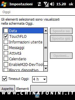 I package, vanno assolutamente installati nell'ordine in cui li ho inseriti, quindi cliccate sull'archivio "01 Collegamenti Outlook e immagini.cab" e così via, fino allo "05 Manila 2D Ita v18.cab". Attenzione: vanno tutti installati su memoria interna! Per questo i terminali devono avere 128-256MB di RAM. Solo l'ultimo package: "06 M2DC v0.25.227.cab" può essere installato sulla memoria esterna, anche perchè dovrà contenere i temi. Non riavviate mai il terminale, fino all'ultimo package, anche se ve lo chiede, date sempre ignora! Una volta terminato di installare tutti i pacchetti riavviate il telefono. Ok, ci siamo?? Ora, andiamo in impostazioni > oggi (settings > today) ![]() ![]() Cliccate su elementi. ![]() Togliete tutti i flag e mettete solo quello su TouchFLO, come nell'immagine. Ora cliccate su OK fino all'uscita. Dopo qualche secondo... ![]() Perfetto, Manila 2D è installato e pronto Cambiare i temi di Manila 2D