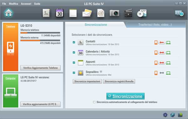 Funzionalità avanzateTrattandosi di un telefono di fascia medio-bassa, questo LG S310 non offre molte funzionalità avanzate. Sono comunque presenti la connettività USB e bluetooth che permettono lo scambio dati con altri dispositivi e lo pongono un gradino più in alto dei cellulari "entry level". LG mette a disposizione gratuitamente una suite per PC, dal nome di "LG PC Suite", che consente di amministrare i dati utente presenti sul telefono, una volta collegatolo ad un PC. Grazie a tale software è possibile leggere e modificare le voci della rubrica, gestire gli SMS salvati, gli appunti di testo ed il contenuto multimediale presente nella memoria interna ed esterna del telefono. Si tratta di una possibilità da non dare per scontata, in quanto addirittura molti smartphone odierni non hanno nessuna suite di gestione da PC, costringendo gli utenti a collegarsi a internet anche per operazioni ormai comuni come la sincronizzazione dei contatti. L'S310 può comunque essere collegato ad un PC anche in modalità "archivio" per funzionare come una qualunque pendrive o come un card reader (vista la presenza dello slot microSD), senza bisogno di driver specifici (l'ho testato personalmente su sistemi operativi più vecchi di 10 anni!). Pur non essendo dotato di connettività 3G o di supporto WiFi, è comunque possibile collegarsi ad internet con il LG S310 mediante una connessione GPRS, almeno per utilizzi basilari come controllare le e-mail o ricevere aggiornamenti sui social network (per la navigazione web la velocità di connessione risulterebbe inadeguata, così come il semplice browser integrato).